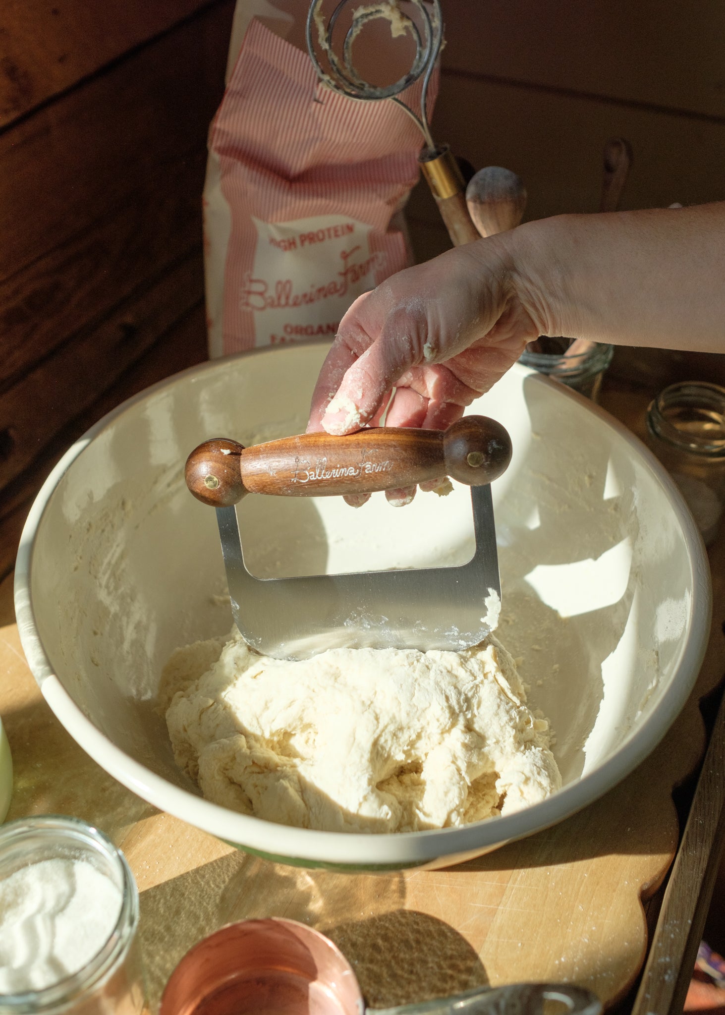 We are welcoming a new bench scraper to the farm kitchen, made with a hand-turned teak wood handle and designed with the guidance of a local woodworker. Made to fit perfectly in your palm with a stainless steel blade, brass accents, and our updated logo, you’re ready to cut dough or scrape your kitchen table with ease. The updated curved corner blade helps to scape the sides of your bowl, assuring you don’t waste anything.