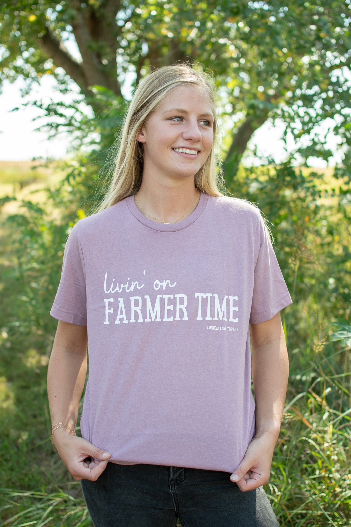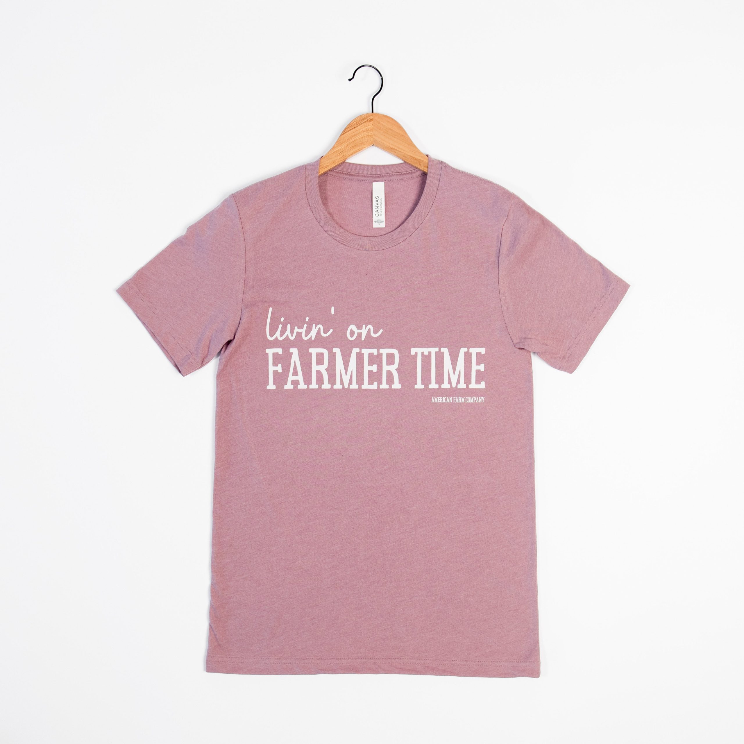 This ‘Livin’ on Farmer Time’ Tee is perfect for those who embrace a farmer’s lifestyle. Made with 100% Cotton. this tee proudly displays the saying Livin’ on Farmer Time. a testament to the hard work and dedication it takes to be a farmer. Wear it proudly and show your support for the farming community.
